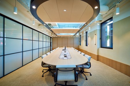 In the executive boardroom, a bespoke SAS600 raft anchors the space. A striking oval module - formed from portrait-mounted SAS TexTiles in Fairfield beige - mirrors the boardroom table below. Framed by a custom black C-Profile, it creates a sense of gravitas and symmetry.